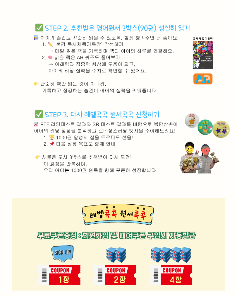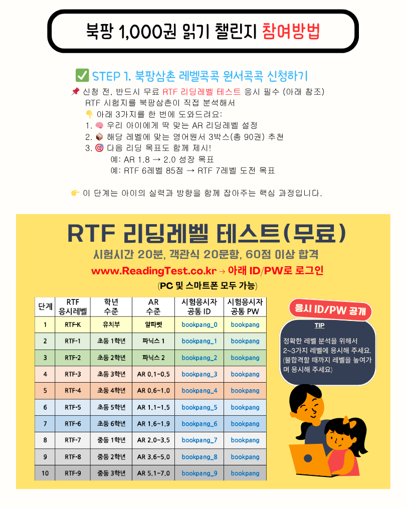 구매하기 RTF 응시유무 옵션 선택 2회 이상 레벨테스트 실시했습니다. (미응시 주문 자동취소됨) RTF 응시자 이름 RTF 응시자 핸드폰 학생 성별 옵션 선택 여자 남자 학년 옵션 선택 4세 유치부5세 유치부6세 유치부7세 초1 초2 초3 초4 초5 초6 중1 중2 중3 북팡 AR ID(선택) 하고 싶은 말씀(선택) 총 상품 금액 0 원 장바구니 구매하기