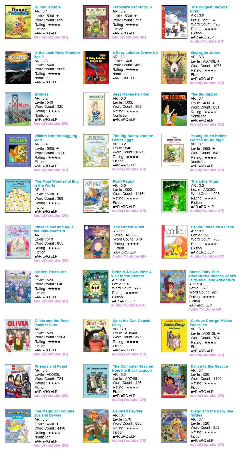 | AR Level | Lexile | Title | Author | AR No | RQ No | IL | Point | Fiction | RP | RV | VP | LS | Rating | Word | Barcode |