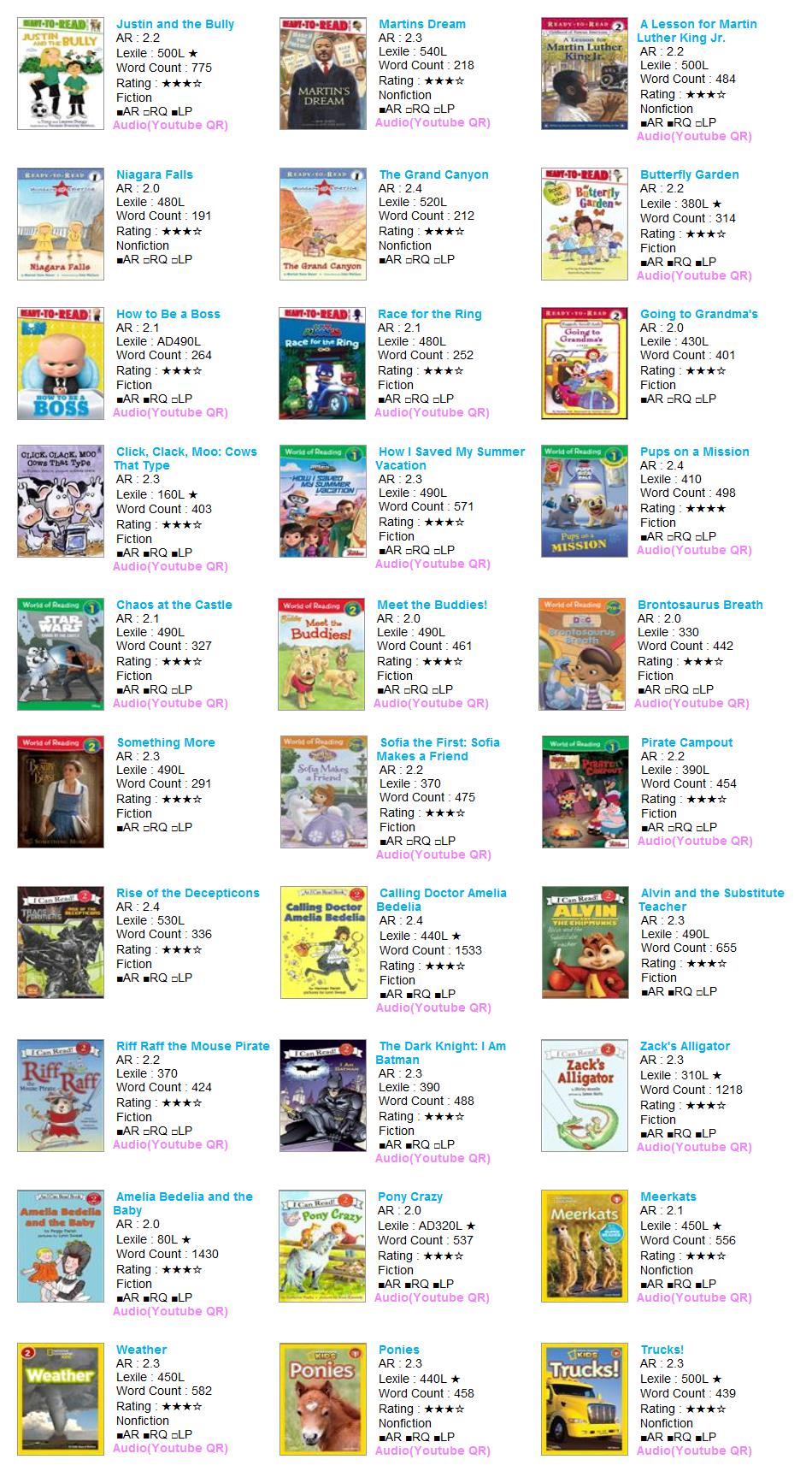 | AR Level | Lexile | Title | Author | AR No | RQ No | IL | Point | Fiction | RP | RV | VP | LS | Rating | Word | Barcode |