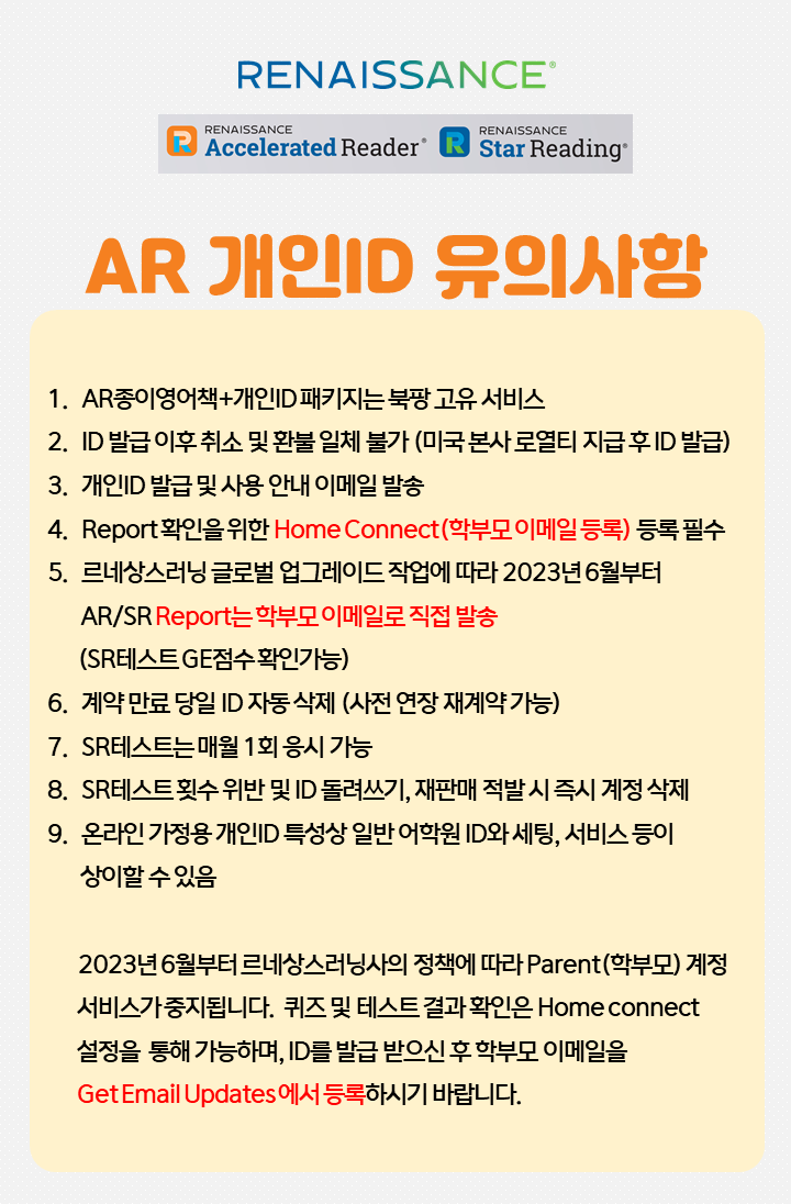 ⑤ AR 개인 아이디는 르네상스러닝 미국 본사에 로열티 지불 후 발급되는 서비스로, 발급 완료 후 환불 및 양도는 절대 불가합니다.