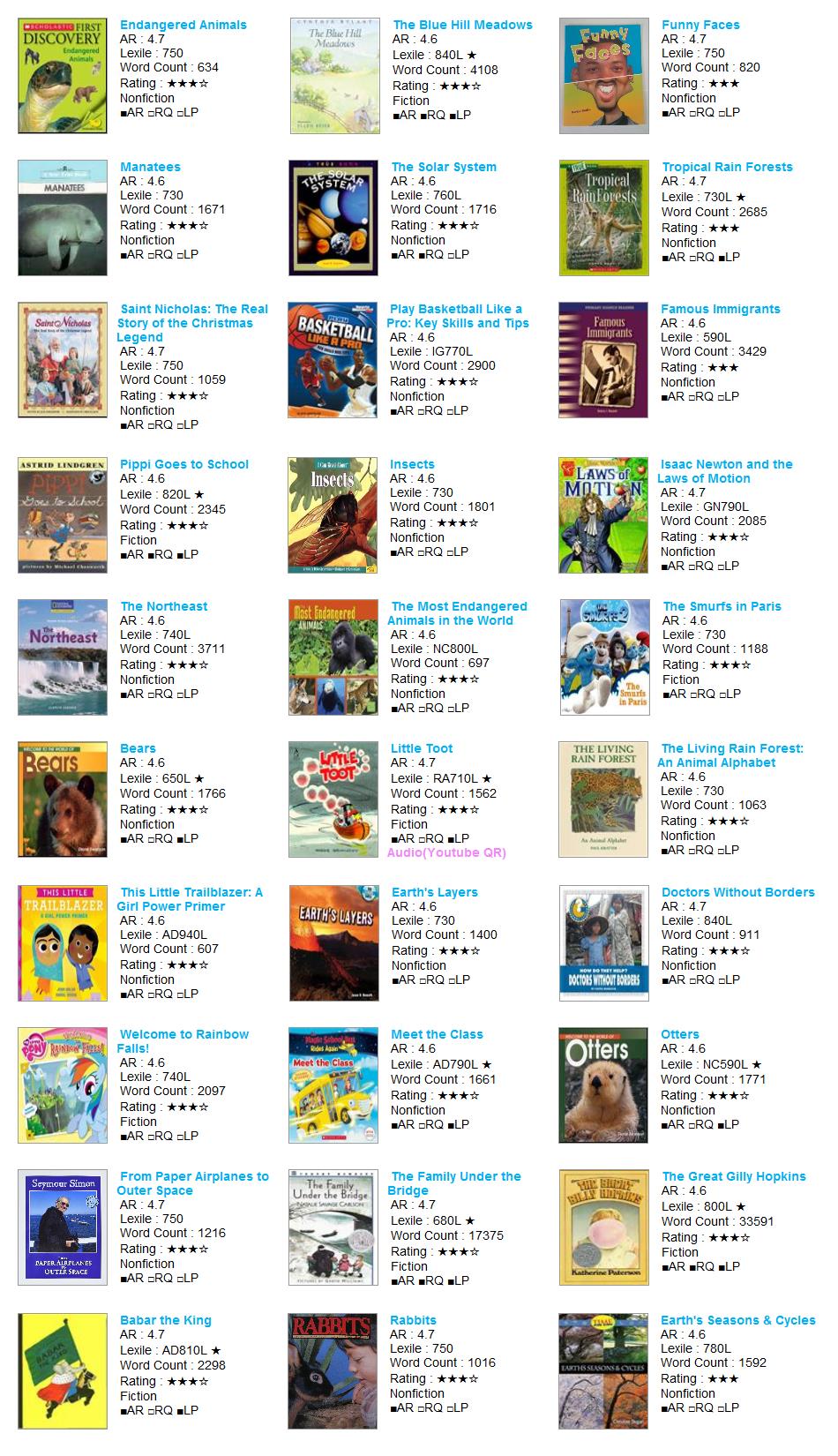 | AR Level | Lexile | Title | Author | AR No | RQ No | IL | Point | Fiction | Rating | Word | Barcode | RP | RV | VP | LS |