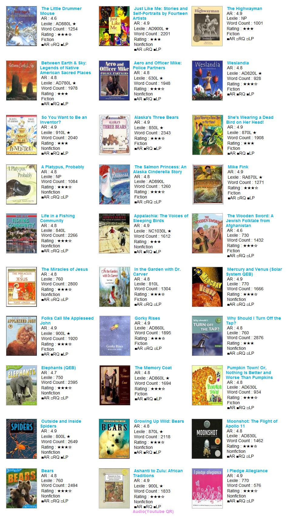 | AR Level | Lexile | Title | Author | AR No | RQ No | IL | Point | Fiction | Rating | Word | Barcode | RP | RV | VP | LS |