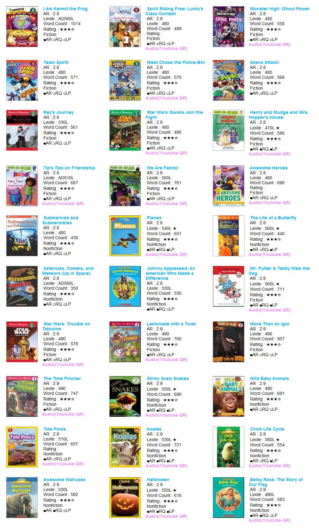 | AR Level | Lexile | Title | Author | AR No | RQ No | IL | Point | Fiction | RP | RV | VP | LS | Rating | Word | Barcode |
