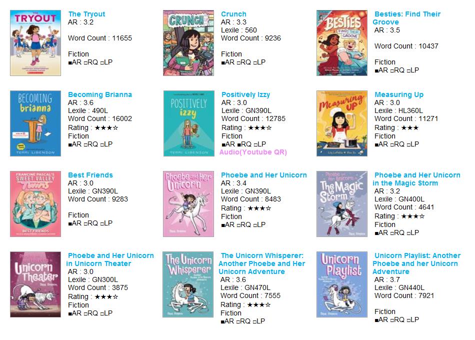 - HOME > 원서대여 > 3점대 스페셜 > 3점대 챕터&그래픽노블 미중복 A > [대여] AR점대 12권 (0059-C41-A03) #그래픽노블 #초등고학년이상 #MG레벨 #여아추천 #여학생추천
