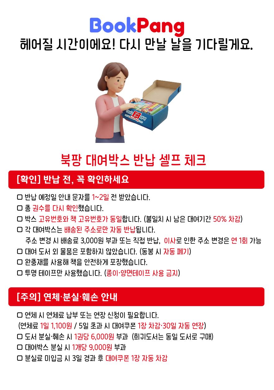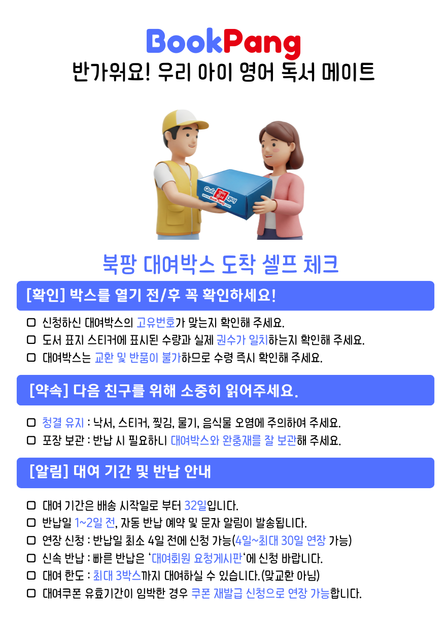 북팡 영어원서대여 이용약관(시행20260110)본 약관은 영어원서대여점 북팡이 제공하는 영어원서대여 서비스 및 관련 부가 서비스의 이용과 관련하여,북팡과 이용자 간의 권리·의무 및 책임사항을 규정함을 목적으로 합니다. ________________________________________ 제1조 (대여 방식 및 쿠폰 제도) ① 북팡 영어원서대여 서비스는 쿠폰회원제로 운영됩니다. ② 본 서비스는 개인회원 전용 서비스이며, 기관·단체·학원·학교·기업 등 법인 또는 단체는 이용할 수 없고, 개인회원으로 가입하였더라도 서비스 이용 형태가 기관 또는 단체 이용으로 확인될 경우 회사는 별도의 사전 통보 없이 서비스 이용을 제한하거나 중단할 수 있습니다. ③ 대여박스는 북팡닷컴에서 판매하는 대여쿠폰으로만 대여 신청이 가능하며, 대여쿠폰 1장당 대여박스 1개를 주문할 수 있습니다. ④ 이용자는 반드시 북팡닷컴 사이트에서 대여박스 쿠폰을 먼저 구매한 후, 원하는 대여박스를 직접 선택하여 주문해야 합니다. ⑤ 결제와 동시에 대여쿠폰은 구매자 계정에 자동 등록되며, 대여박스 주문 시 [대여쿠폰 사용 → 무통장 0원 결제] 방식으로 신청합니다. ⑥ 대여쿠폰 환불은 구매일로부터 30일 이내이며, 전체 쿠폰 사용량이 30% 미만인 경우에만 가능합니다. 그 이후에는 환불이 절대 불가합니다. ⑦ 대여쿠폰 환불 신청은 대여회원요청 게시판을 통해서만 접수되며, 사용한 대여쿠폰 1장당 39,000원(대여정가 33,000원 + 왕복 택배비 6,000원)을 차감한 후 잔액을 구매자 계좌로 환불합니다. ________________________________________ 제2조 (대여 기간 및 대여 한도) ① 대여박스 기본 대여 기간은 32일이며, 대여 시작일은 배송시작 시점 기준으로 산정됩니다. ② 일반 반납은 반납일에 택배 기사님이 회수 방문하며, 별도의 반납 신청은 필요하지 않습니다.(단, 신속반납 신청 건은 제외) ③ 대여 연장 기간은 최소 4일 이상, 최대 30일 이하로 제한되며, 연장 기간을 초과할 경우 반드시 반납해야 합니다. ④ 동시 대여 한도는 최대 3박스로 제한되며, 도서 분실·연체·오반납·오염 등 사고 발생 시 회사 판단에 따라 대여 한도가 제한될 수 있습니다. ⑤ 신속반납 신청은 기존 반납 예정일 4일 이전까지 가능하며, [대여회원요청] 게시판을 통해서만 접수됩니다. ⑥ 모든 반납 접수는 택배사 시스템상 취소가 불가하므로, 대여 연장 시에도 택배 기사님이 기존 반납일에 방문할 수 있으며, 이 경우 이용자는 기사님께 반납 취소 또는 미반납 안내를 직접 회신해야 합니다. ________________________________________ 제3조 (대여쿠폰 유효기간 및 관리) ① 대여쿠폰의 유효기간은 다음과 같습니다. 3쿠폰: 구매일로부터 3개월 6쿠폰: 구매일로부터 6개월 12쿠폰: 구매일로부터 12개월 ② 대여쿠폰은 구매자 본인만 사용 가능하며, 타인에게 양도·대여·판매·공유할 수 없고, 양도 또는 부정 사용이 확인될 경우 회사는 해당 쿠폰을 회수하거나 서비스 이용을 제한할 수 있습니다. ③ 유효기간이 만료된 쿠폰은 사용이 불가합니다. ④ 만료 전 사용이 어려운 잔여 쿠폰은 재발급 신청을 통해 사전 유효기간 연장이 가능합니다. ⑤ 잔여 쿠폰 재발급은 3개월 / 6개월 / 12개월 단위로,[대여쿠폰 재발급] 상품 구매를 통해서만 신청 가능하며 재발급 수수료가 발생합니다.(기간별 수수료 상이) ⑥ 재발급된 쿠폰의 유효기간은 수수료 결제일 기준으로 새롭게 시작됩니다. (예: 2026년 1월 5일 재발급 3개월 신청 시 → 유효기간 2026.1.5 ~ 4.5) ⑦ 모든 대여쿠폰은 마이페이지 ▶ 쿠폰내역에서 확인 가능하며, 반드시 유효기간 내 사용해야 합니다. ________________________________________ 제4조 (반납 및 자동 반납 안내) ① 반납일 1~2일 이전 자동 반납 예약 및 문자 알림이 발송되며, 별도의 반납 신청 없이 반납 준비를 하면 됩니다. ② 대여박스의 반송지 주소는 원칙적으로 변경이 불가하며, 주소 변경 시 반송료 3,000원을 부담하거나 직접 선불 택배로 반납해야 하고, 단 이사로 인한 주소 변경은 연 1회에 한하여 무상으로 허용됩니다. ③ 이미 예약된 택배 반송 건은 취소가 불가하므로, 택배기사 문자 수신 시 반송 물품이 없는 경우 이용자가 직접 ‘방문 불필요’ 회신해야 합니다. ④ 대여 신청서 외의 물품은 즉시 폐기되며, 회사는 이에 대한 반환 책임을 지지 않습니다. ________________________________________ 제5조 (대여 연체 및 연체료) ① 기존 반납일에 반납이 어려운 경우 반드시 사전 연장 신청을 해야 합니다. ② 미반납된 대여박스는 반납 예정일 다음 날부터 연체일이 자동 산정됩니다. ③ 연체 5일 초과 시 자동으로 30일 연장 처리되며, 대여쿠폰 1장이 차감됩니다. (잔여 쿠폰이 없는 경우 연체료 부과) ④ 연체료는 1일당 1,100원입니다. ________________________________________ 제6조 (반납 포장 및 박스 규정) ① 도서 표지에 부착된 도서번호(예: ex0012-A32-A01)와 대여박스 번호는 반드시 일치해야 합니다. ② 반드시 대여 시 받은 동일 번호의 박스(파란색 플라스틱 전용 상자)에 담아 반납해야 합니다. ③ 박스가 변경된 상태로 반납될 경우 연체 처리되며, 남은 대여 기간의 50%가 차감되어 조기반납 처리됩니다. ④ 총 권수는 이