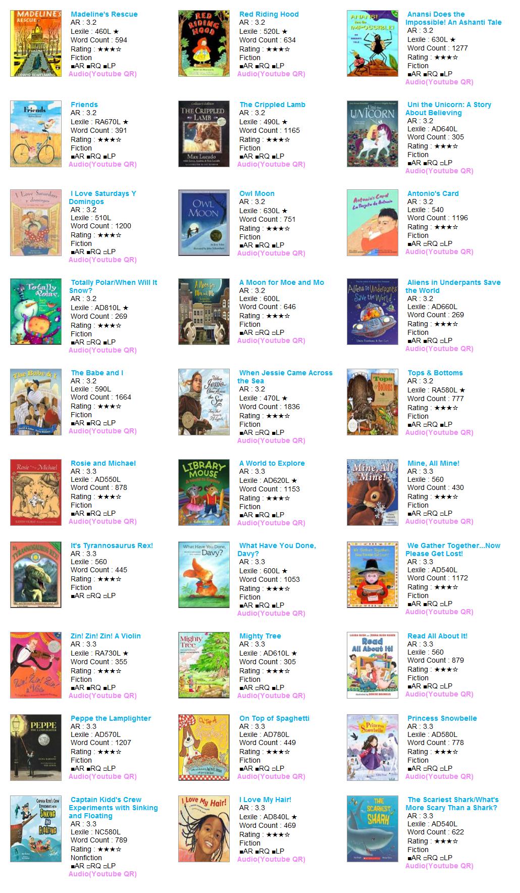 | AR Level | Lexile | Title | Author | AR No | RQ No | IL | Point | Fiction | RP | RV | VP | LS | Rating | Word | Barcode |