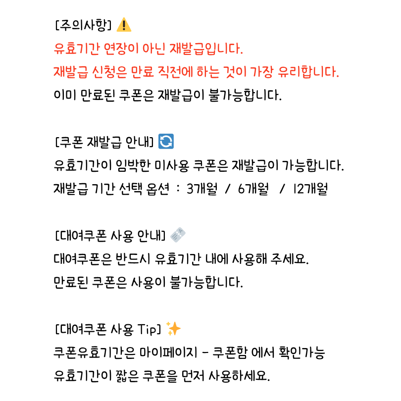 구매하기 전체 잔여 대여쿠폰 재발급 옵션 선택 유효기간 3개월 유효기간 6개월(+15,000) 유효기간 12개월(+30,000) 취소 불가 확인 옵션 선택 처리된 재발급 건은 취소가 되지 않음을 확인하였습니다. 총 상품 금액 0 원 장바구니 구매하기