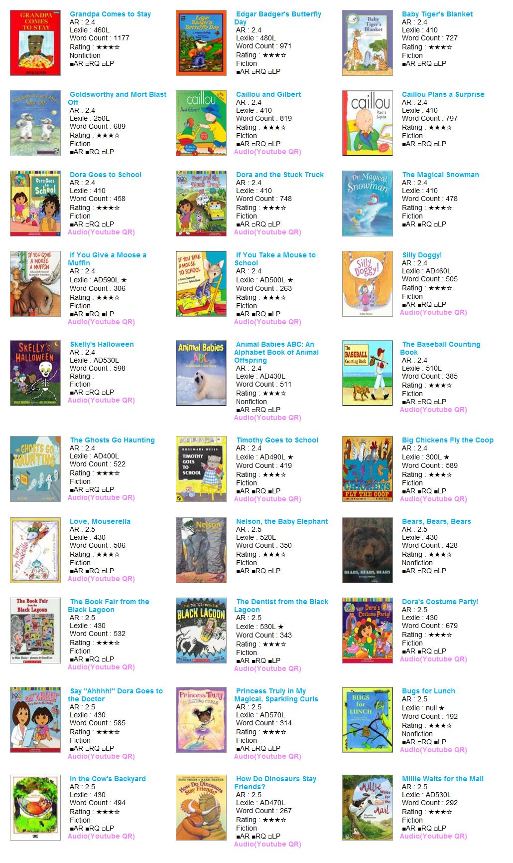 | AR Level | Lexile | Title | Author | AR No | RQ No | IL | Point | Fiction | RP | RV | VP | LS | Rating | Word | Barcode |