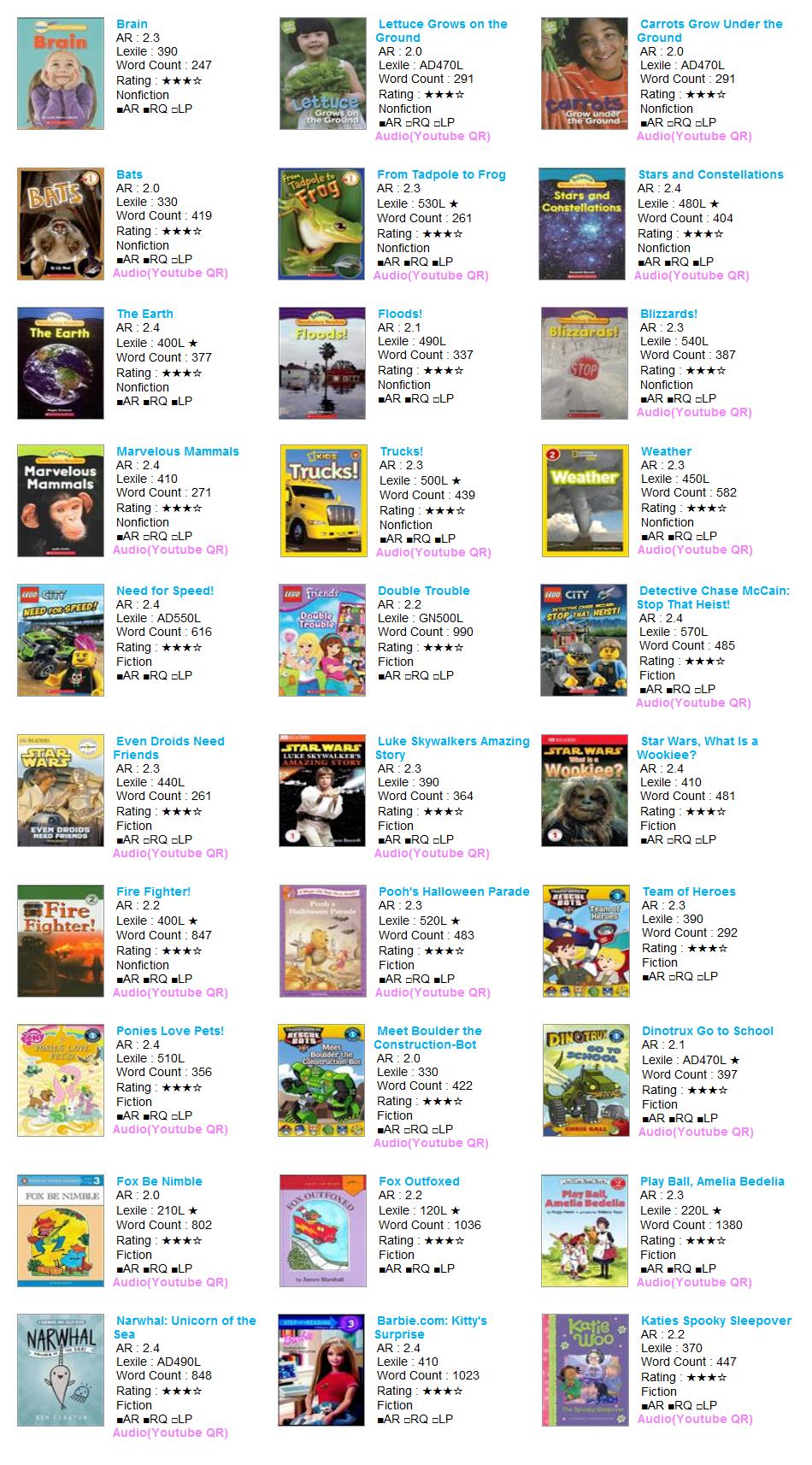 | AR Level | Lexile | Title | Author | AR No | RQ No | IL | Pts | Fiction | RP | RV | VP | LS | Rating | Word | Barcode |