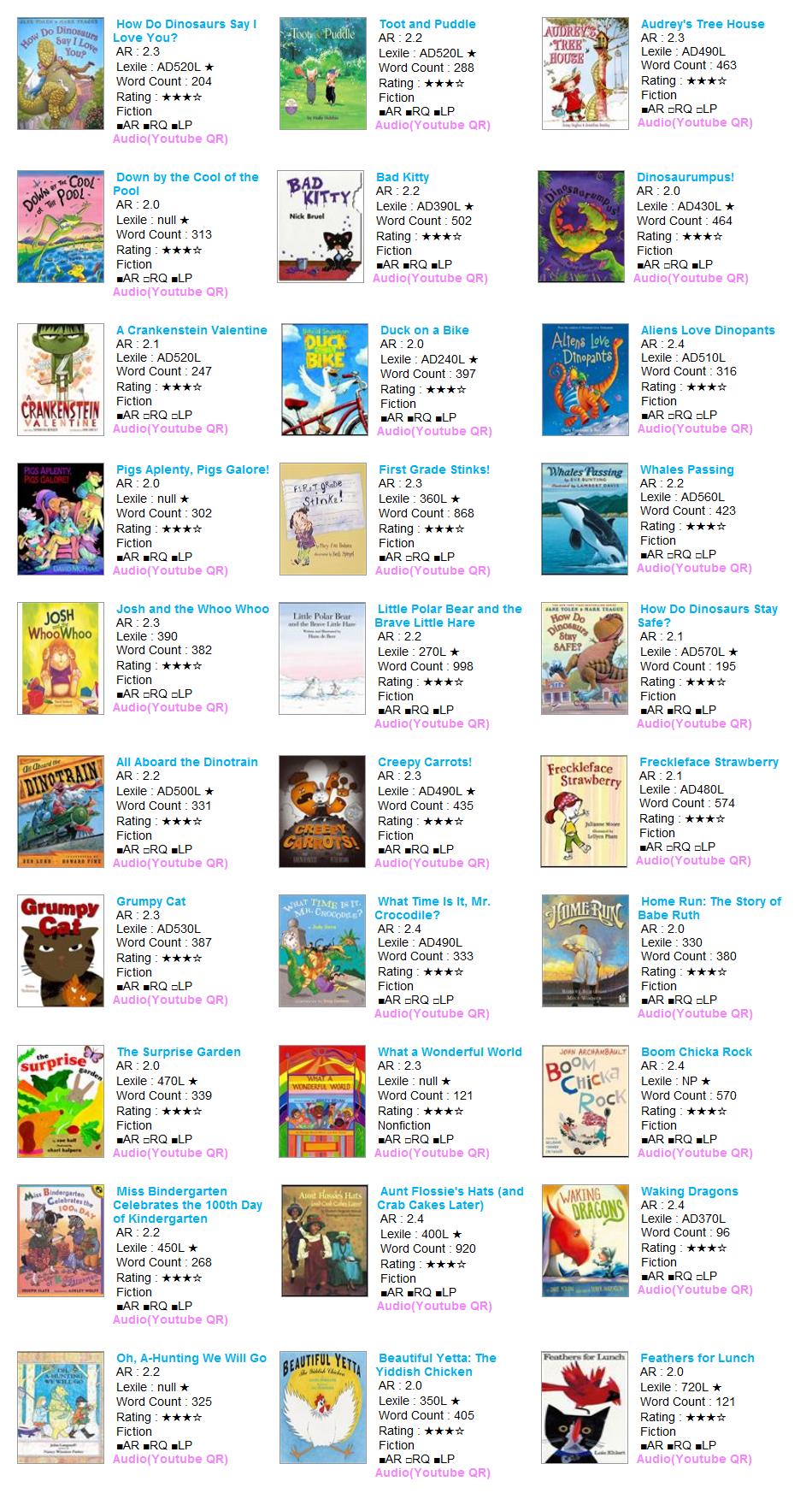 | AR Level | Lexile | Title | Author | AR No | RQ No | IL | Pts | Fiction | RP | RV | VP | LS | Rating | Word | Barcode |