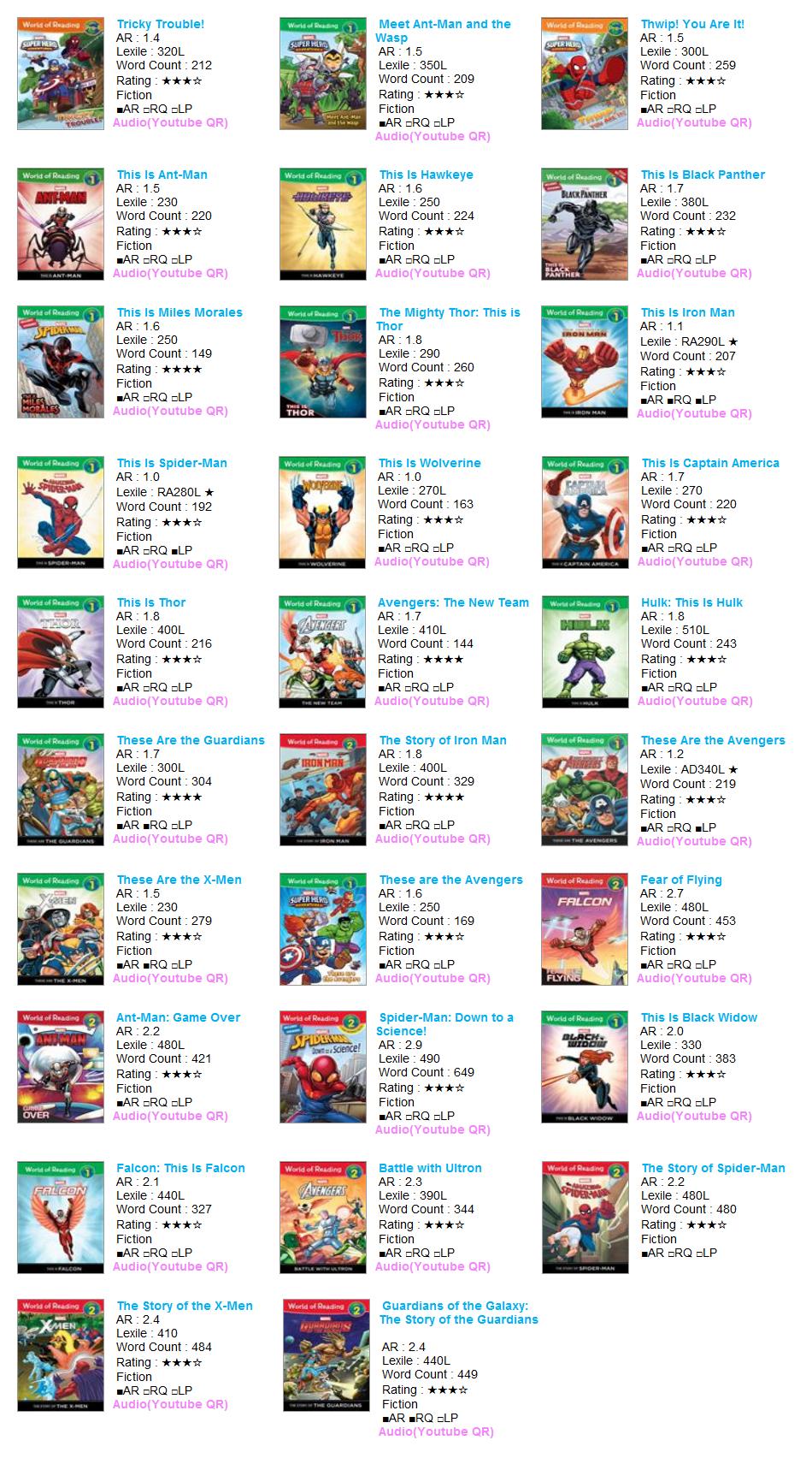 | AR Level | Lexile | Title | Author | AR No | RQ No | IL | Point | Fiction | RP | RV | VP | LS | Rating | Word | Barcode |