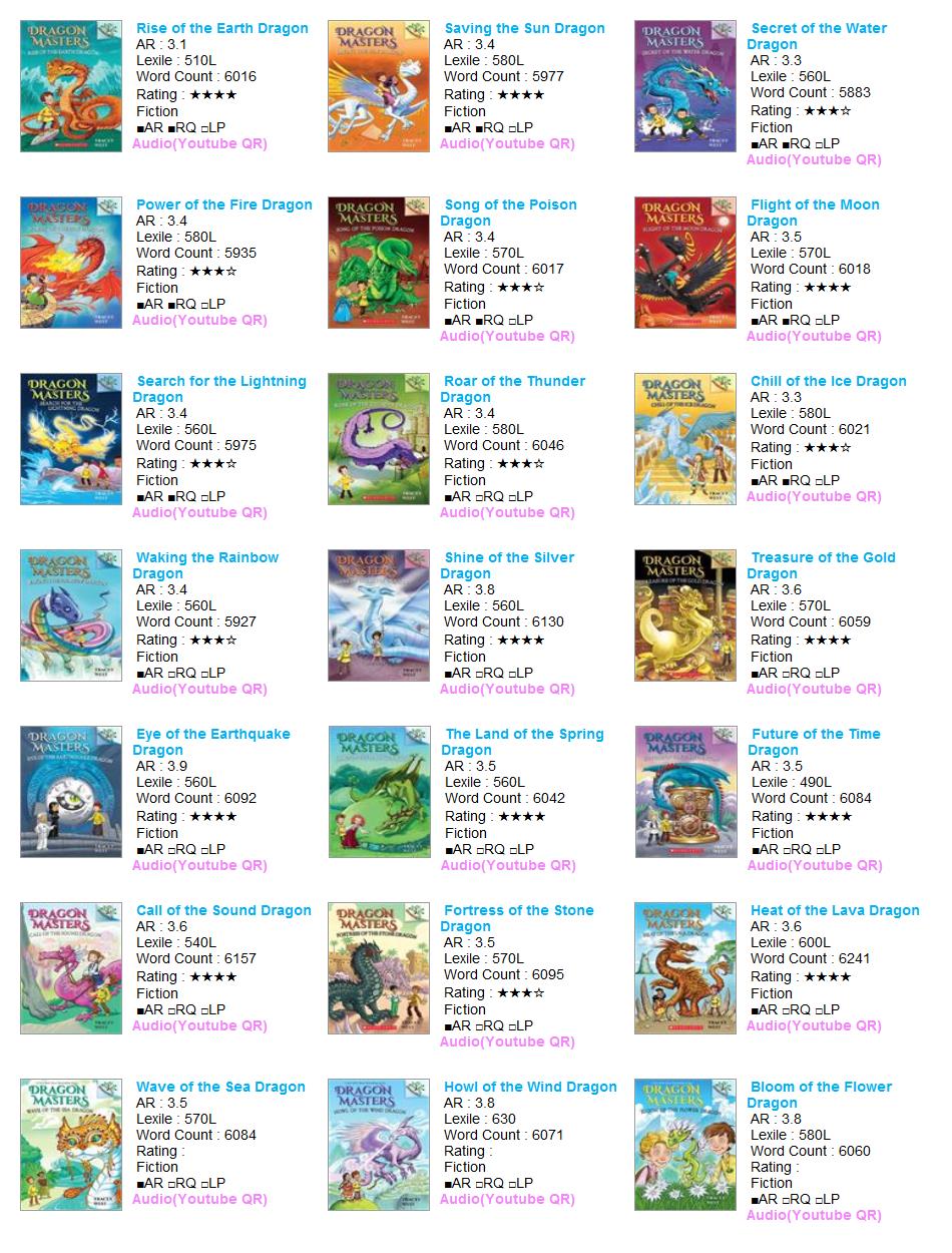 | AR Level | Lexile | Title | Author | AR No | RQ No | IL | Point | Fiction | RP | RV | VP | LS | Rating | Word | Barcode |