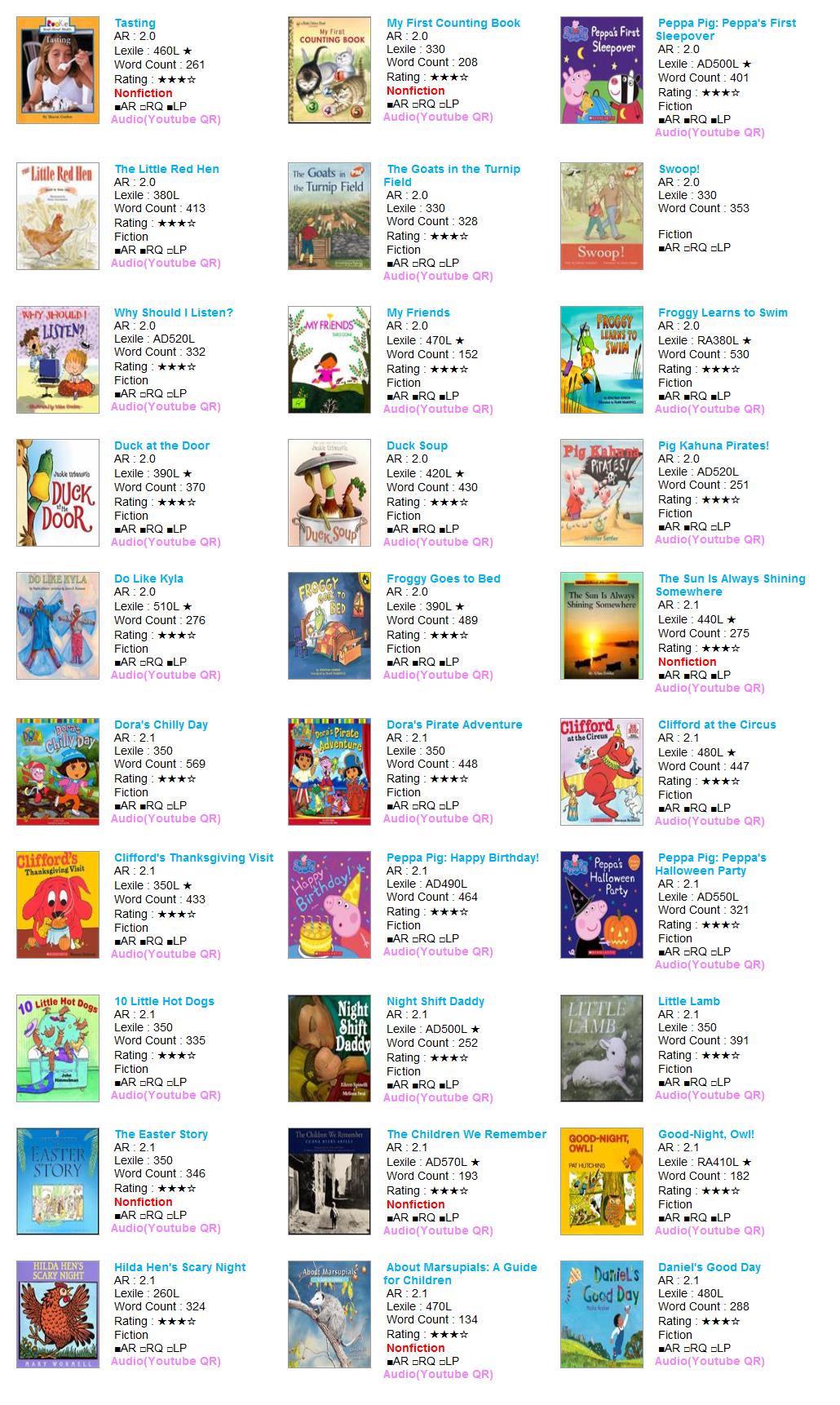 - HOME > 원서대여 > 2점대(0.2단위) 미중복 C > AR 2.0~2.1 > [대여] AR 2점대 30권 (0041-B12-A02) #픽처북 #미니북 #캐릭터북 #논픽션6권 #도라 #클리포드 #페파피그