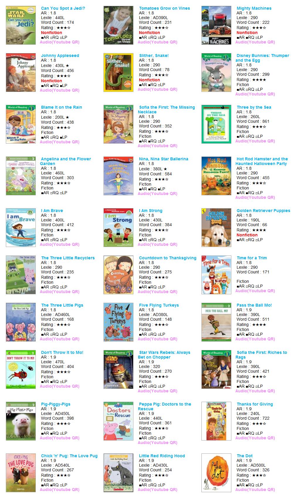 - HOME > 원서대여 > 1점대(0.2단위) 미중복 E > AR 1.8~1.9 > [대여] AR 1점대 30권 (0060-B12-A01) #리더스북 #캐릭터북 #논픽션6권 #월드오브리딩 #스콜라스틱리더 #펭귄영리더스