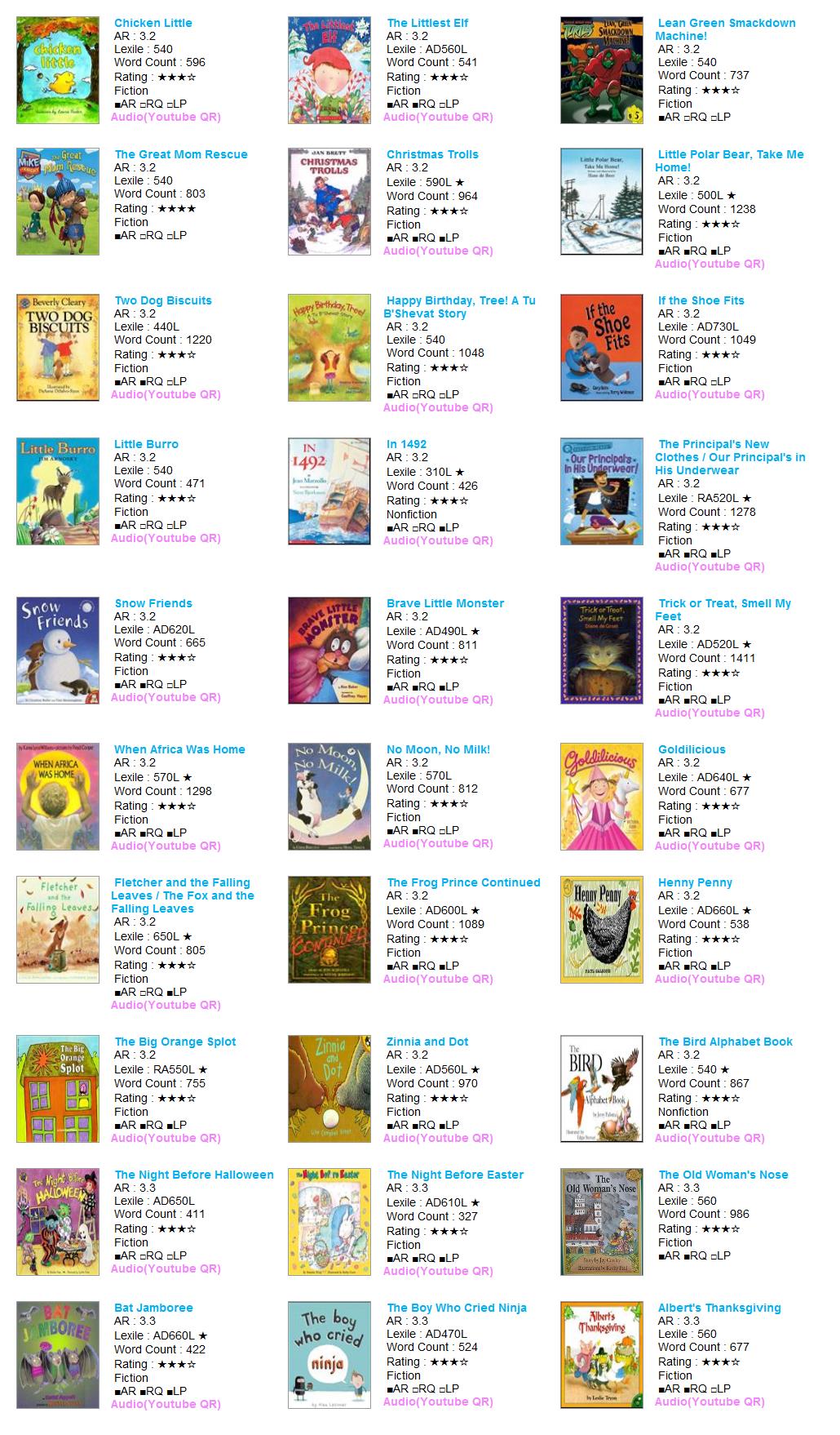 | AR Level | Lexile | Title | Author | AR No | RQ No | IL | Point | Fiction | RP | RV | VP | LS | Rating | Word | Barcode |