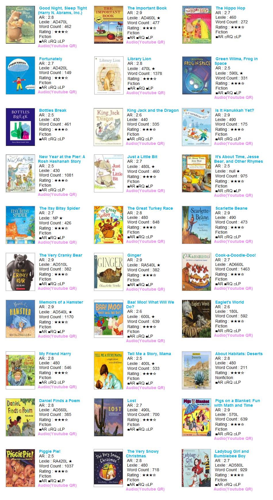 | AR Level | Lexile | Title | Author | AR No | RQ No | IL | Pts | Fiction | RP | RV | VP | LS | Rating | Word | Barcode |
