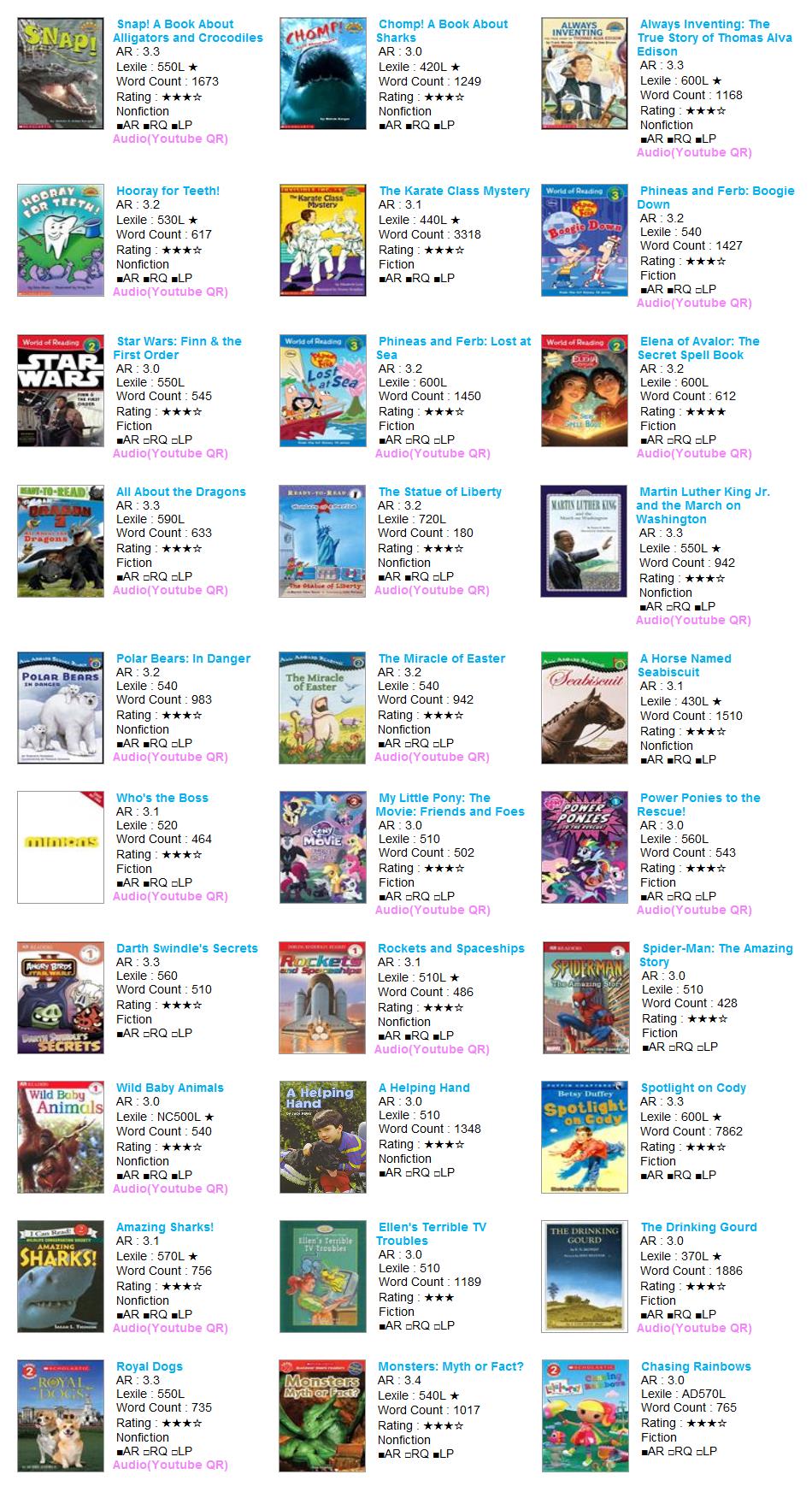 | AR Level | Lexile | Title | Author | AR No | RQ No | IL | Pts | Fiction | RP | RV | VP | LS | Rating | Word | Barcode |