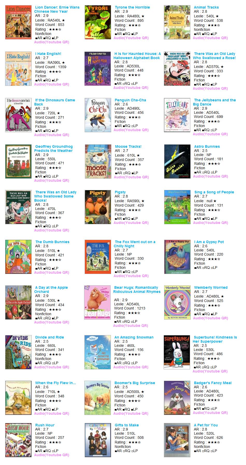| AR Level | Lexile | Title | Author | AR No | RQ No | IL | Point | Fiction | RP | RV | VP | LS | Rating | Word | Barcode |