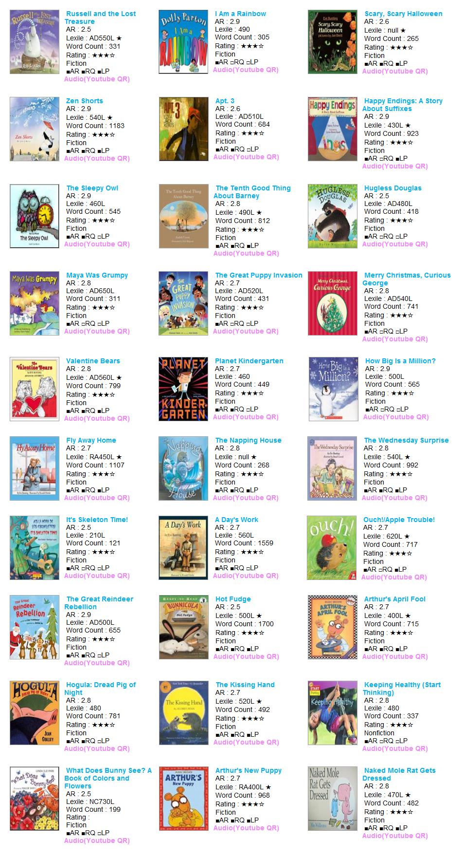 | AR Level | Lexile | Title | Author | AR No | RQ No | IL | Point | Fiction | Rating | Word | Barcode | RP | RV | VP | LS |