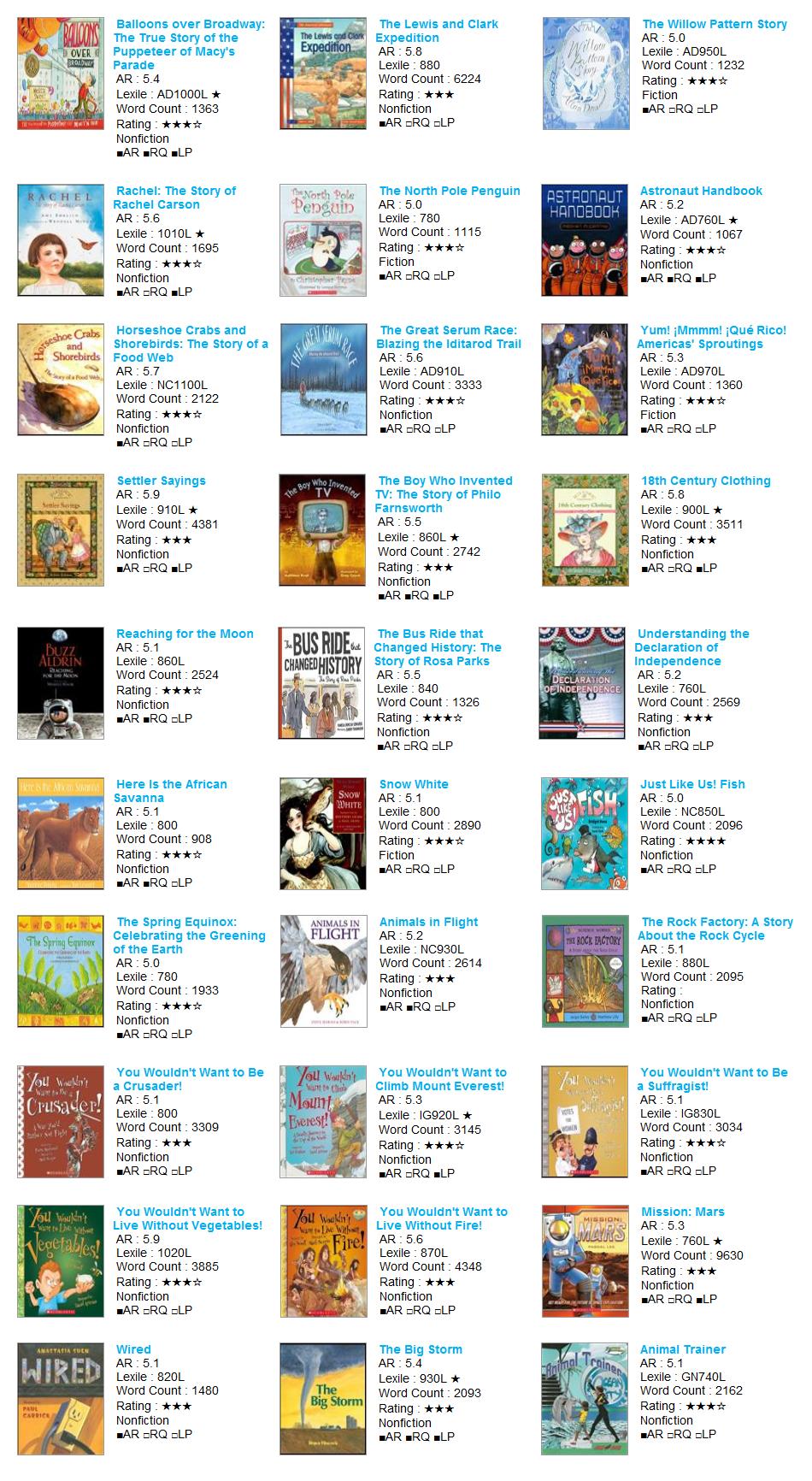| AR Level | Lexile | Title | Author | AR No | RQ No | IL | Point | Fiction | Rating | Word | Barcode | RP | RV | VP | LS |