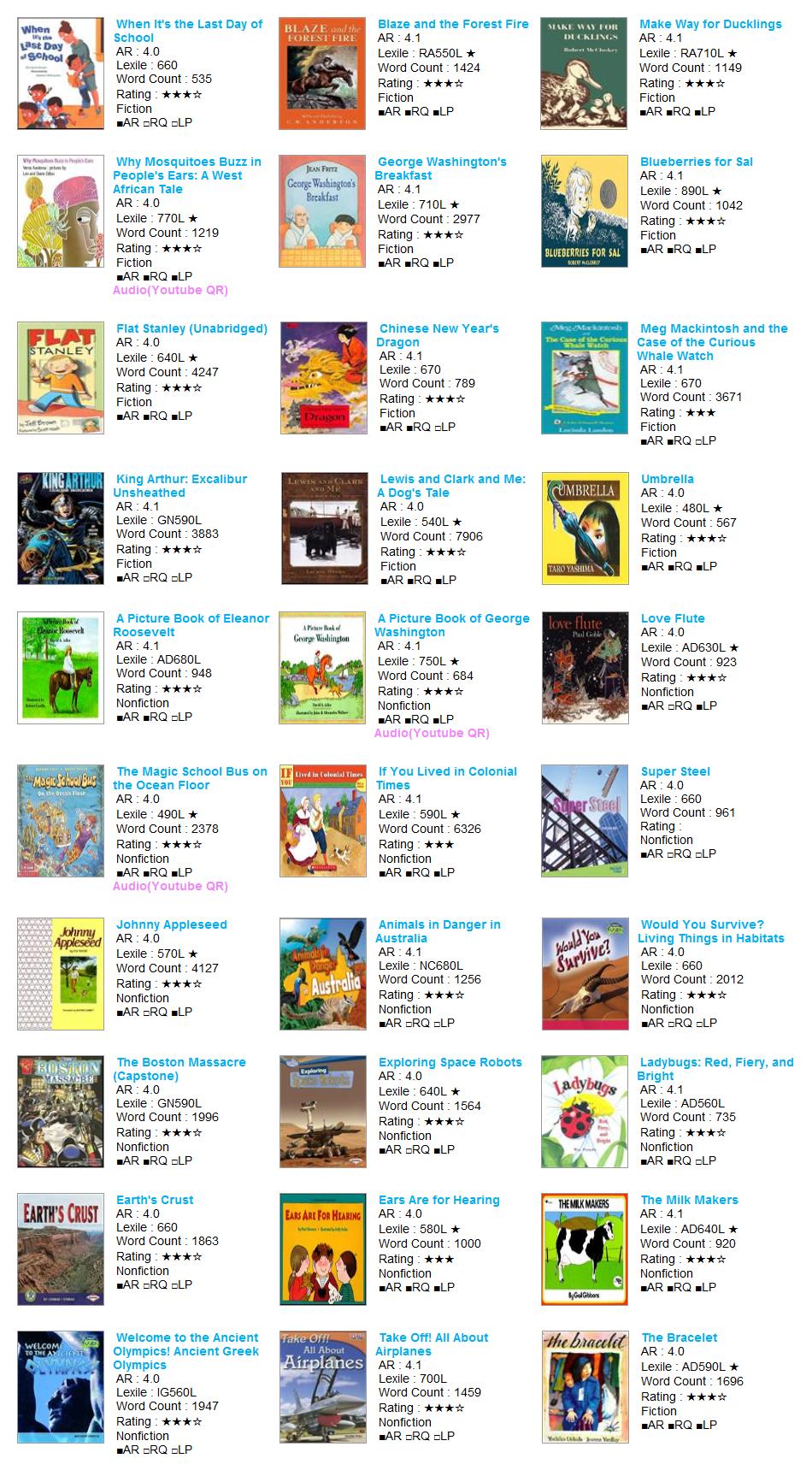 | AR Level | Lexile | Title | Author | AR No | RQ No | IL | Point | Fiction | Rating | Word | Barcode | RP | RV | VP | LS |