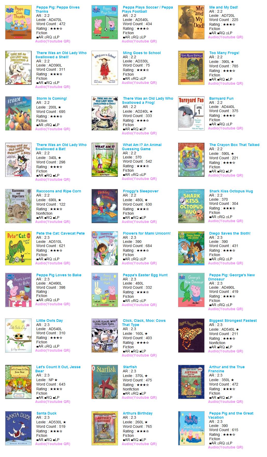 | AR Level | Lexile | Title | Author | AR No | RQ No | IL | Point | Fiction | RP | RV | VP | LS | Rating | Word | Barcode |