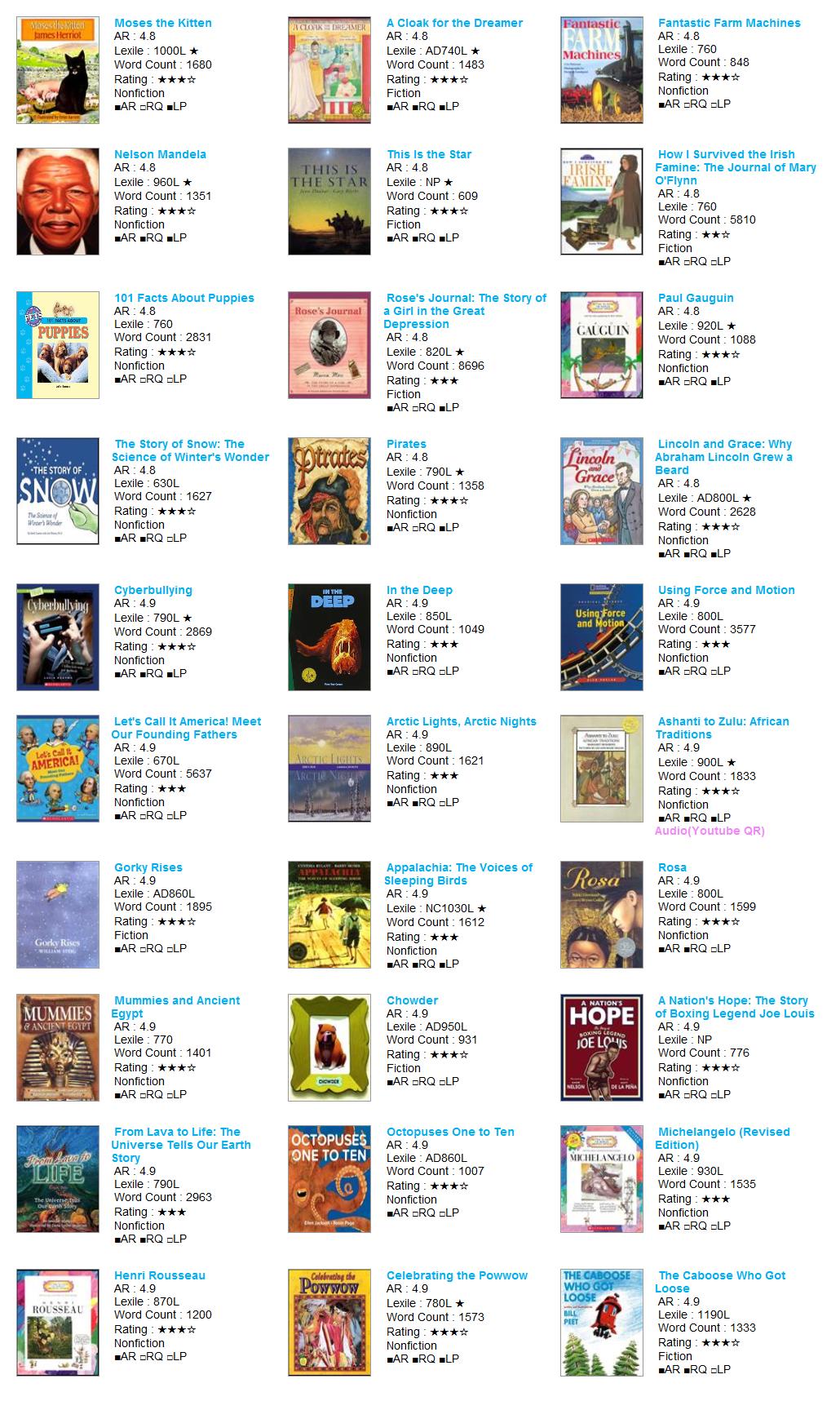 | AR Level | Lexile | Title | Author | AR No | RQ No | IL | Point | Fiction | RP | RV | VP | LS | Rating | Word | Barcode |