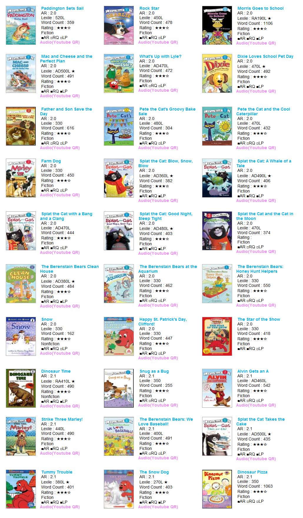 | AR Level | Lexile | Title | Author | AR No | RQ No | IL | Point | Fiction | RP | RV | VP | LS | Rating | Word | Barcode |