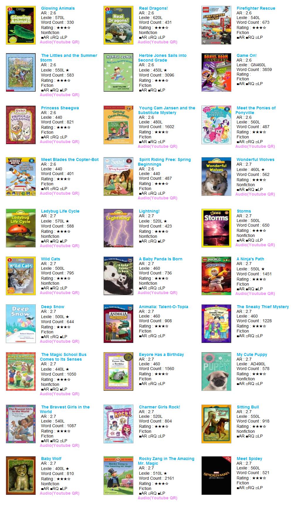 | AR Level | Lexile | Title | Author | AR No | RQ No | IL | Point | Fiction | RP | RV | VP | LS | Rating | Word | Barcode |