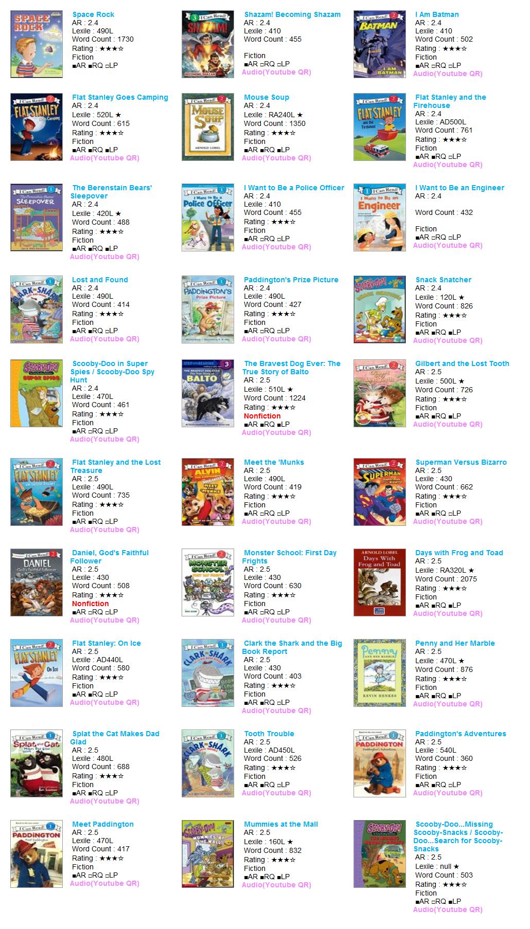 - HOME > 원서대여 > 2점대(0.2단위) 미중복 C > AR 2.4~2.5 > [대여] AR 2점대 30권 (0057-C31-A02) #리더스북 #아이캔리드 #스텝인투리딩 #스쿠비두 #패딩턴 #플랫스탠리