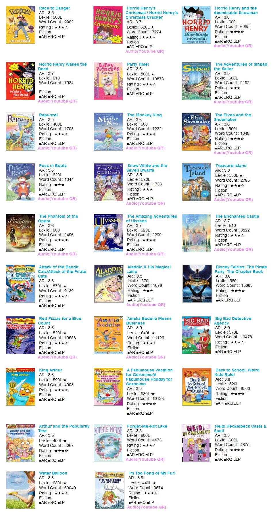| AR Level | Lexile | Title | Author | AR No | RQ No | IL | Point | Fiction | Rating | Word | Barcode | RP | RV | VP | LS |