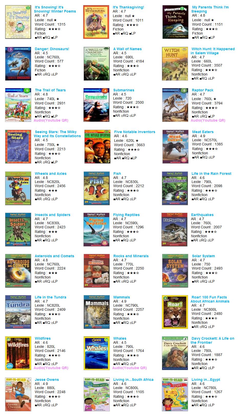 AR LevelLexileTitleAuthorAR NoRQ NoILPtsFictionRPRVVPLSRatingWordBarcode