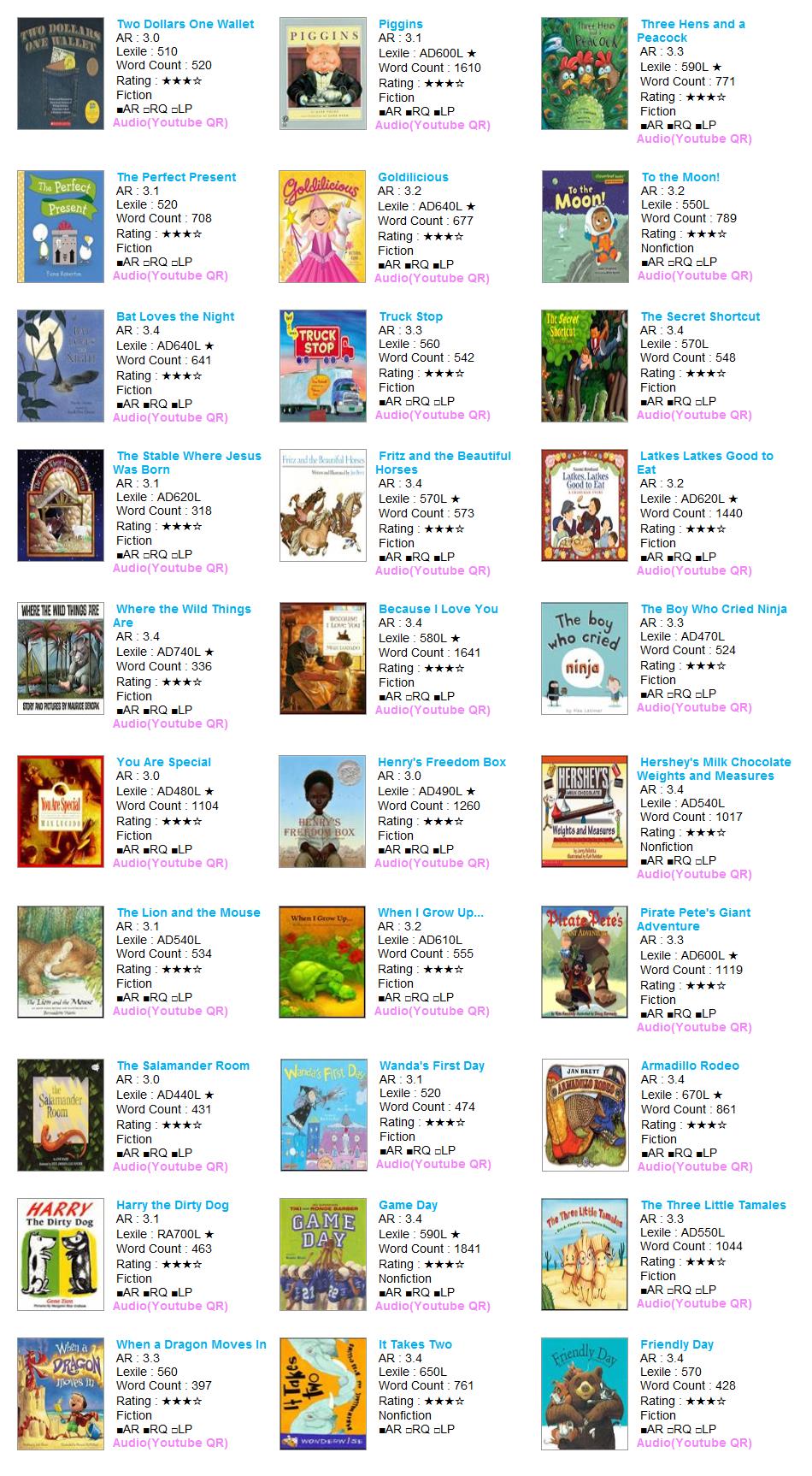 | AR Level | Lexile | Title | Author | AR No | RQ No | IL | Point | Fiction | RP | RV | VP | LS | Rating | Word | Barcode |