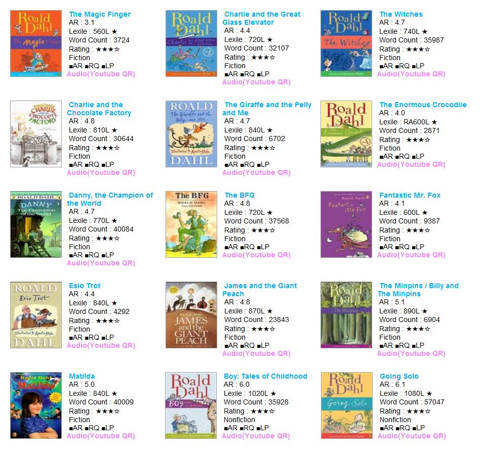 | AR Level | Lexile | Title | Author | AR No | RQ No | IL | Point | Fiction | Rating | Word | Barcode | RP | RV | VP | LS |