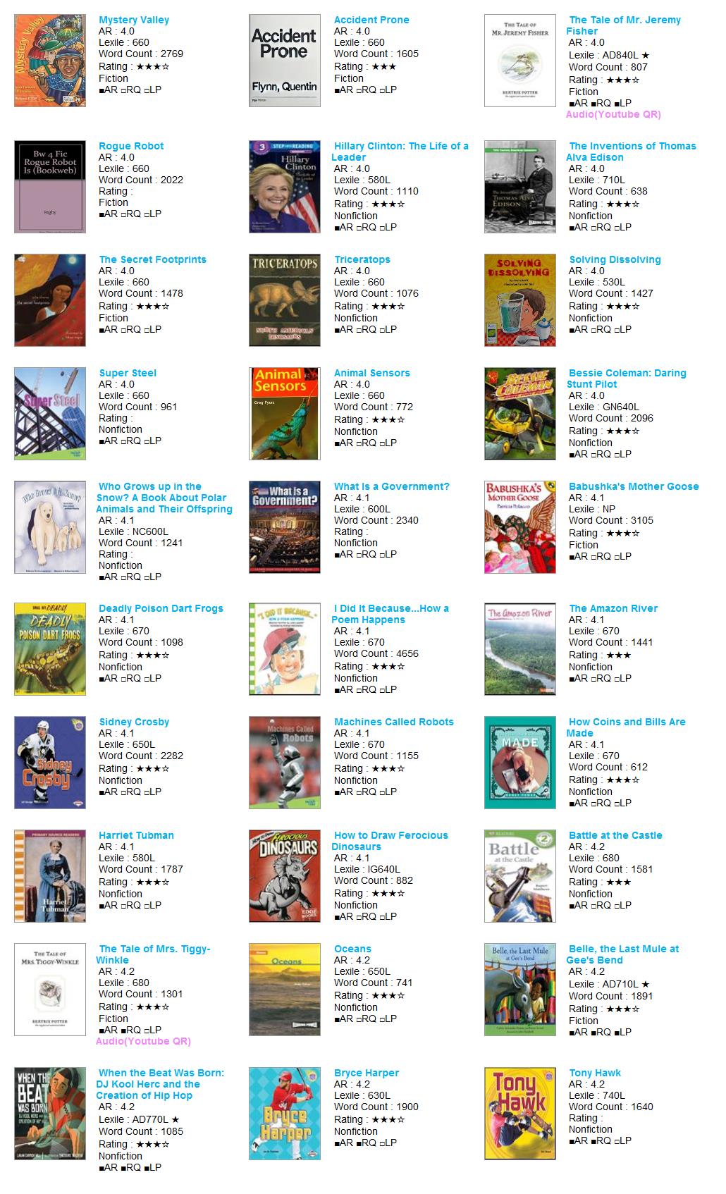 | AR Level | Lexile | Title | Author | AR No | RQ No | IL | Point | Fiction | RP | RV | VP | LS | Rating | Word | Barcode |