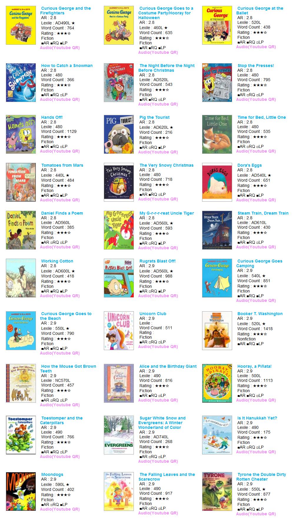 - HOME > 원서대여 > 2점대(0.2단위) 미중복 B > AR 2.8~2.9 > [대여] AR 2점대 30권 (0057-B51-A02) #픽처북 #캐릭터북 #스폰지밥 #큐리어스조지 #칼데콧1권