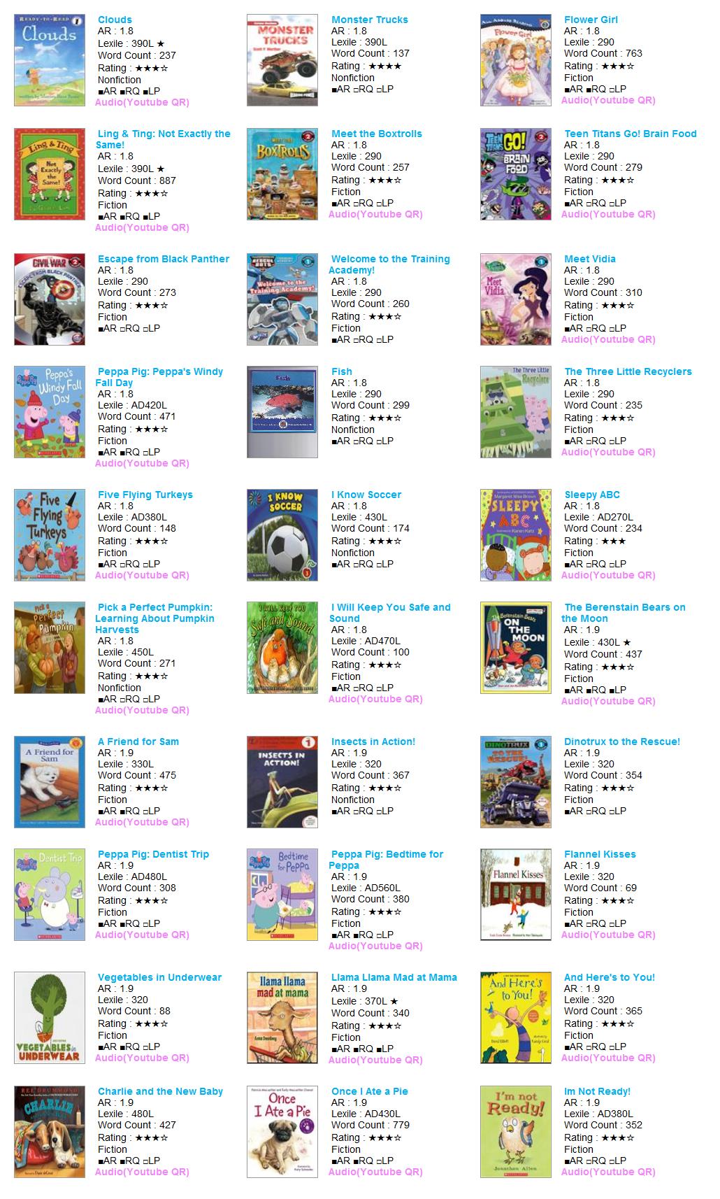 | AR Level | Lexile | Title | Author | AR No | RQ No | IL | Point | Fiction | RP | RV | VP | LS | Rating | Word | Barcode |