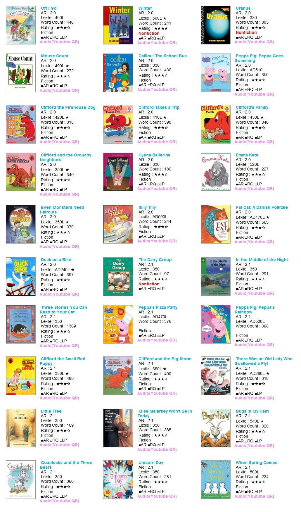 - HOME > 원서대여 > 2점대(0.2단위) 미중복 C > AR 2.0~2.1 > [대여] AR 2점대 30권 (0041-C21-A02) #픽처북 #캐릭터북 #미니북 #클리포드 #페파피그 #까이유
