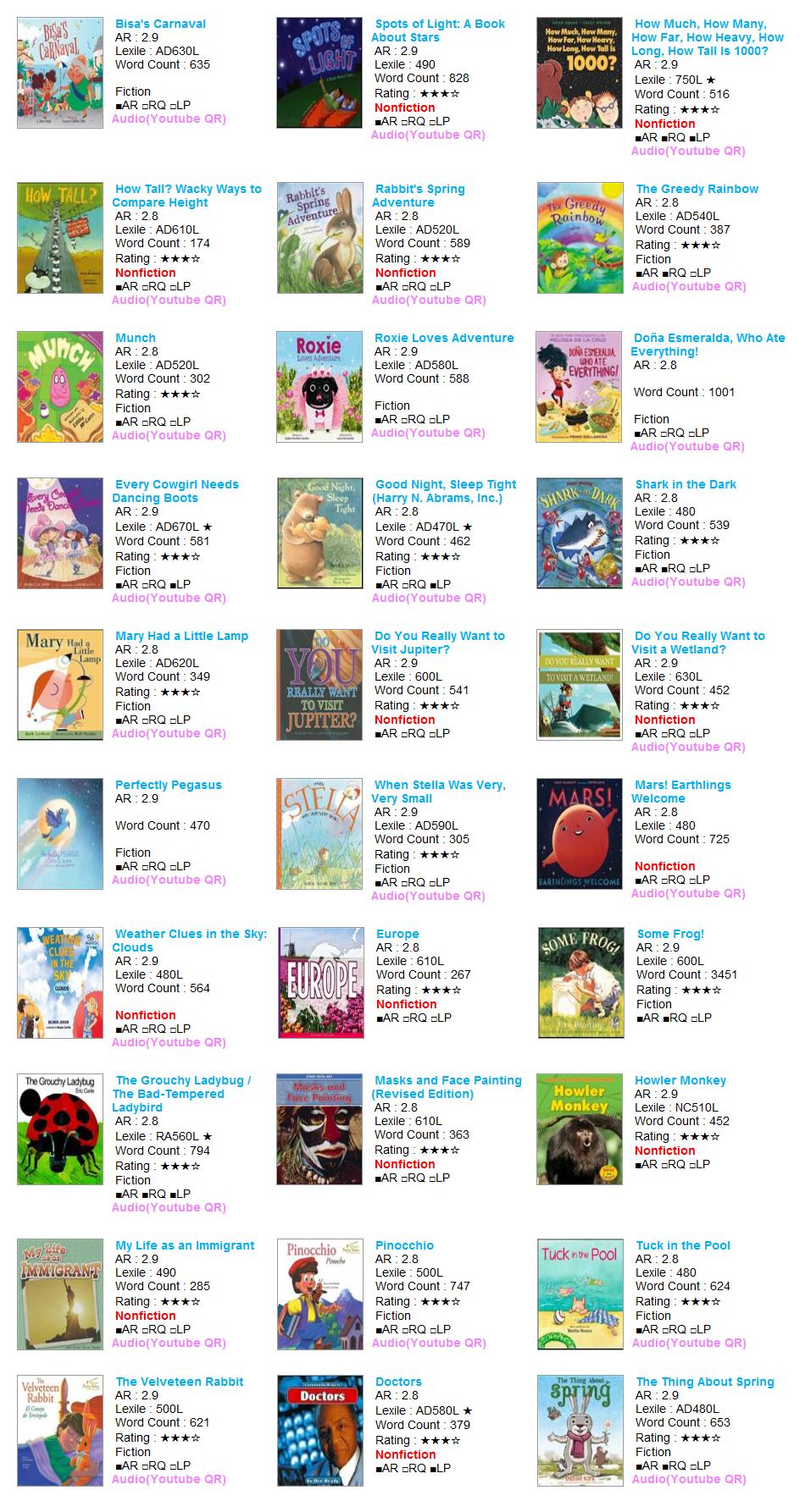 | AR Level | Lexile | Title | Author | AR No | RQ No | IL | Point | Fiction | Rating | Word | Barcode | RP | RV | VP | LS |